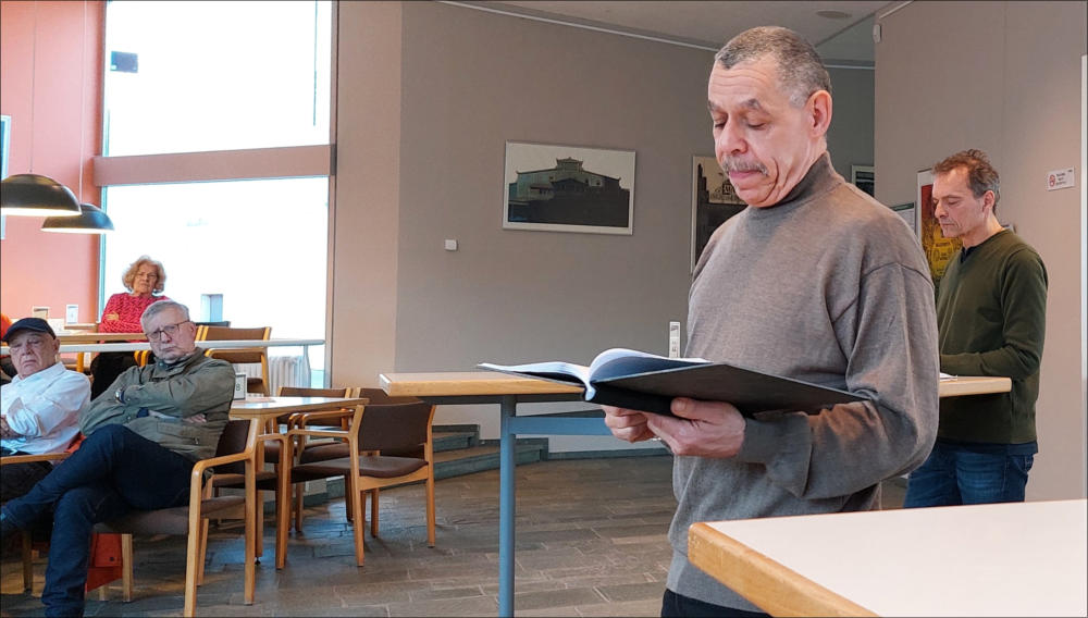 seine Inszenierung „Die Ermittlung“ zu sprechen, die als szenische Lesung am folgenden Tag